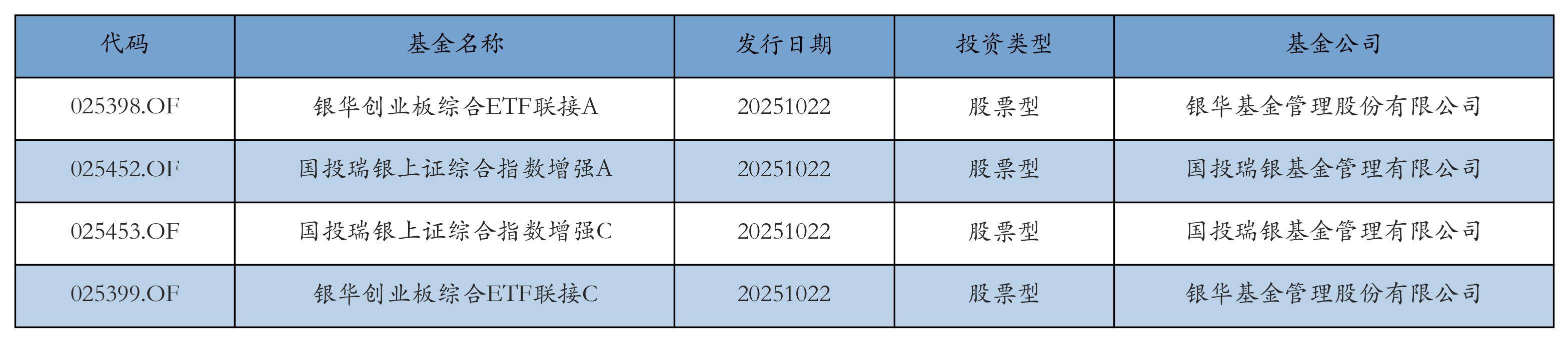 昨日有4只新基金发行,分别为:银华创业板综合ETF联接A、国投瑞银上证综合指数增强A、国投瑞银上证综合指数增强C、银华创业板综合ETF联接C,详情见下表: