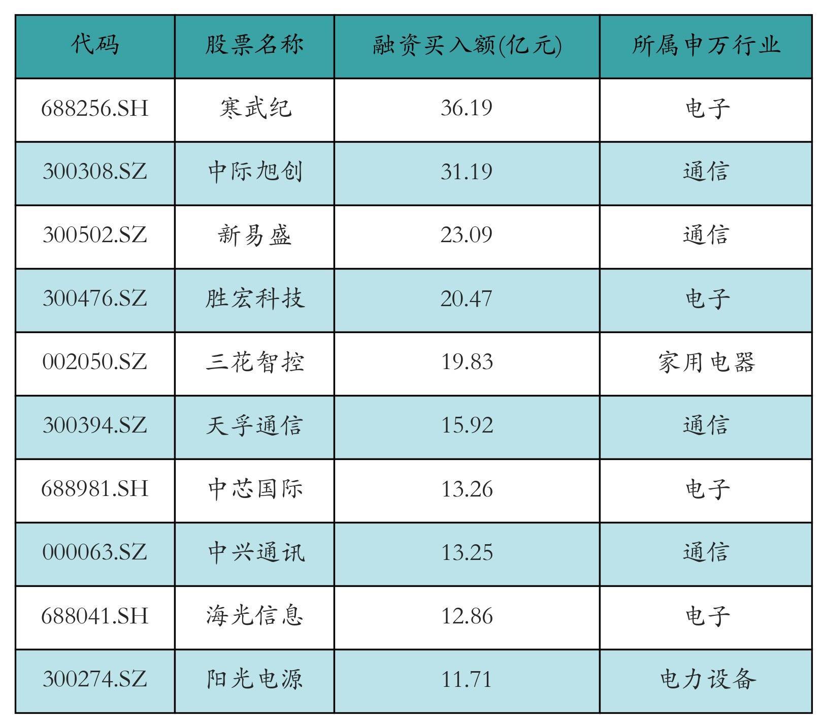 两市共有3455只个股有融资资金买入,其中寒武纪、中际旭创、新易盛排名前三,买入金额分别36.19亿元、31.19亿元、23.09亿元。融资买入额前10个股详情见下表: