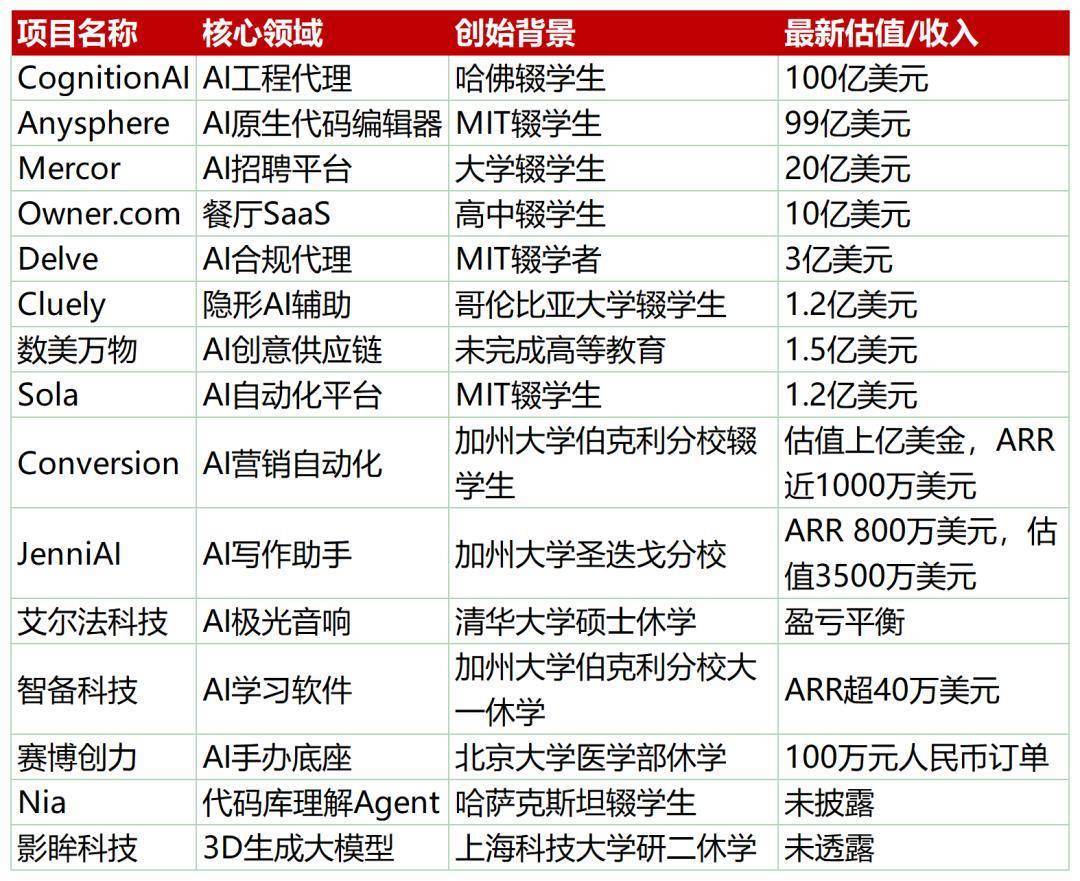 02 独角兽频出!Z世代CEO杀疯了如果说,2023年辍学创业潮瞄准通用人工智能等,那么到了2025年,这类人的创业策略已经完全转变: